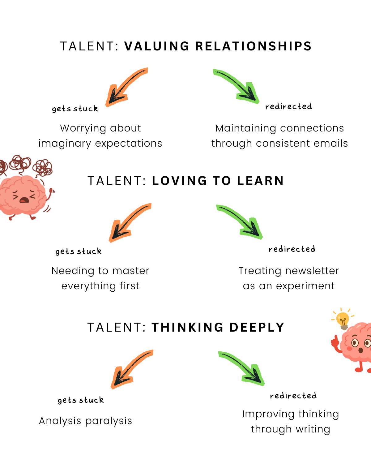 🛑 Valuing relationship → worrying about imaginary expectations 🛑 Loving to learn → needing to master everything before starting 🛑 Thinking deeply → analysis paralysis