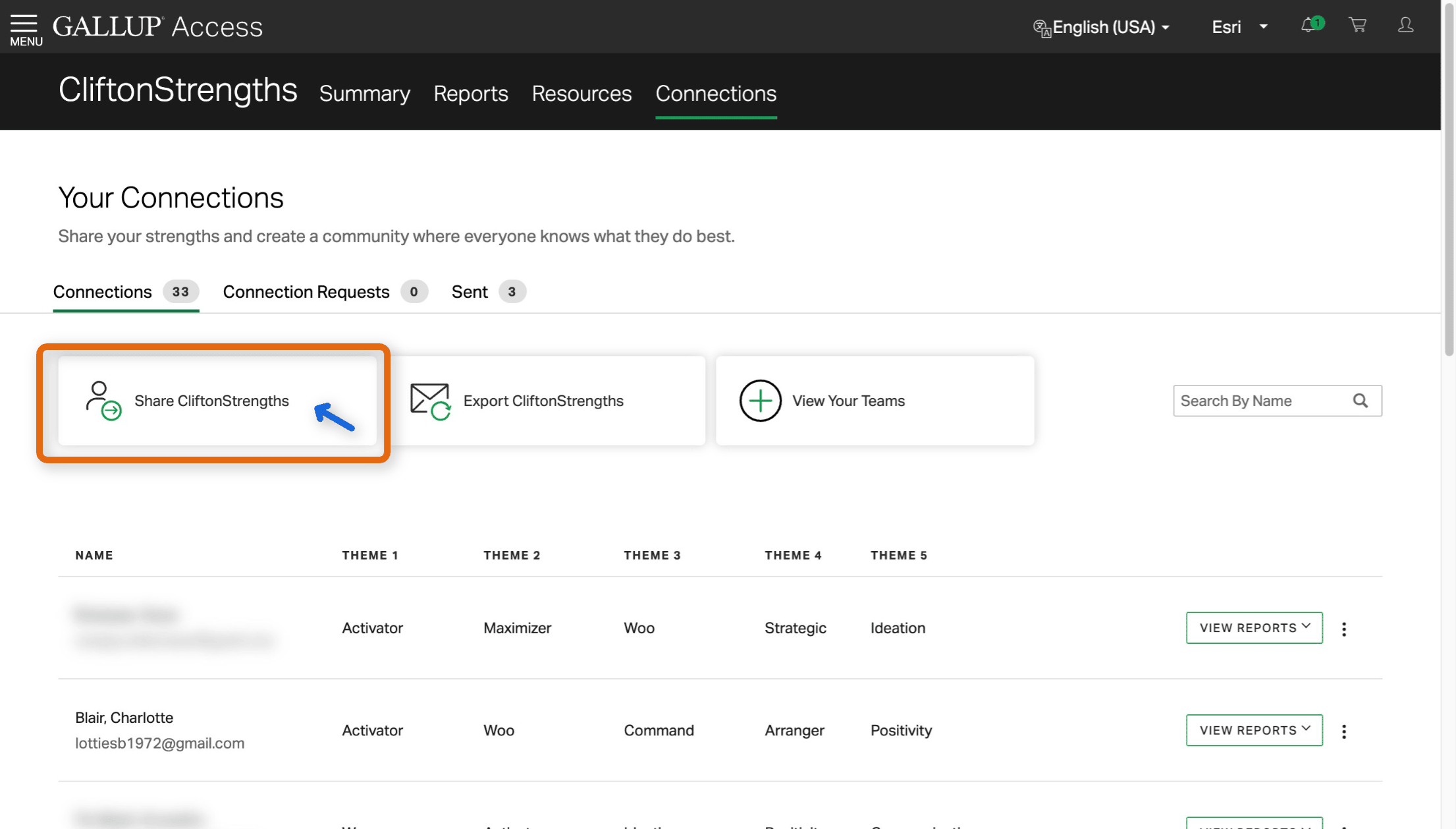 Note: If you do not see your partner's name, you'll need to have your partner login to their account and share their CliftonStrengths report with you.
